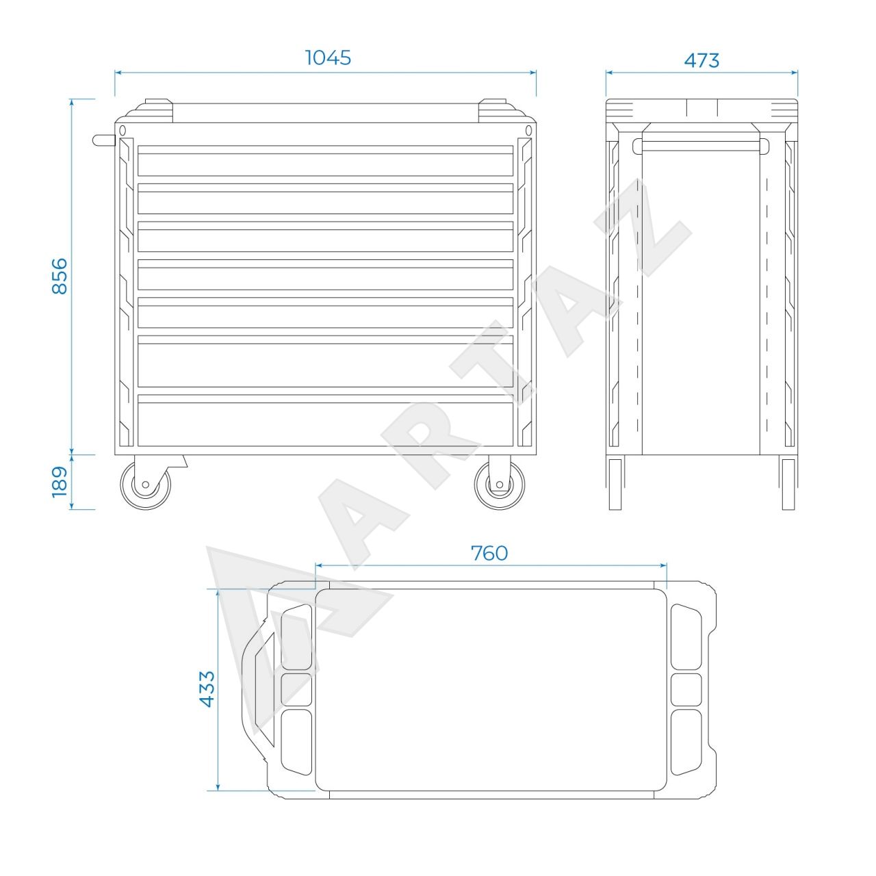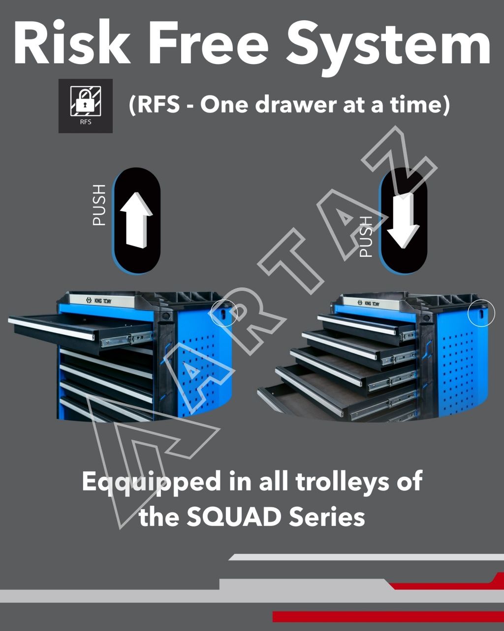Тележка оснащена пятью небольшими и двумя большими выдвижными ящиками с подшипниковыми направляющими, которые выдерживают нагрузку до 700 кг. Надёжная сварная конструкция с порошковым покрытием обеспечивает долговечность и устойчивость к износу. Центральный замок с удобной системой RFS предотвращает случайное открытие нескольких ящиков одновременно, повышая безопасность использования. Встроенные доводчики гарантируют плавное закрытие ящиков без шума и повреждений. Колёса 125х50 мм с фиксацией обеспечивают лёгкое и комфортное перемещение тележки по рабочему пространству.