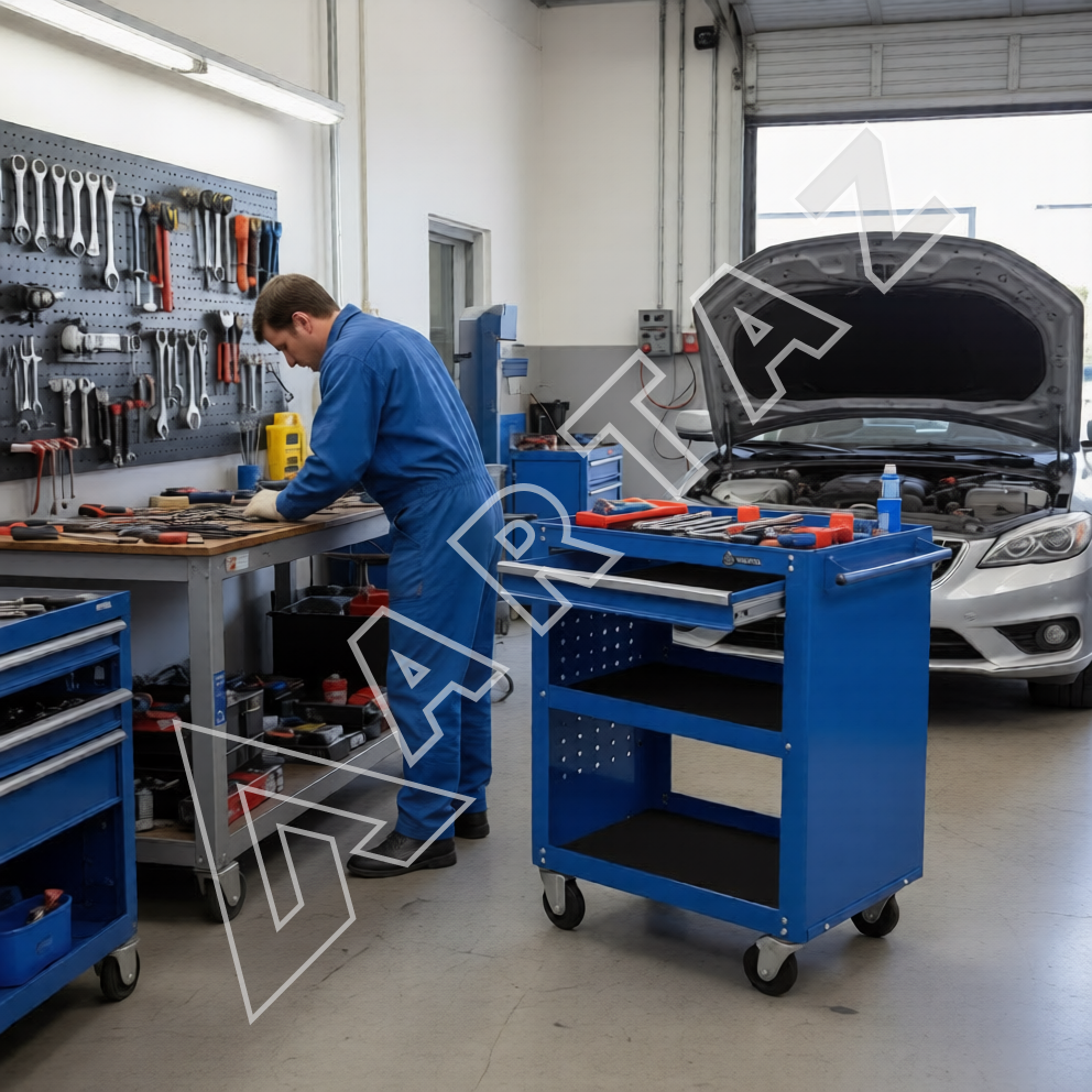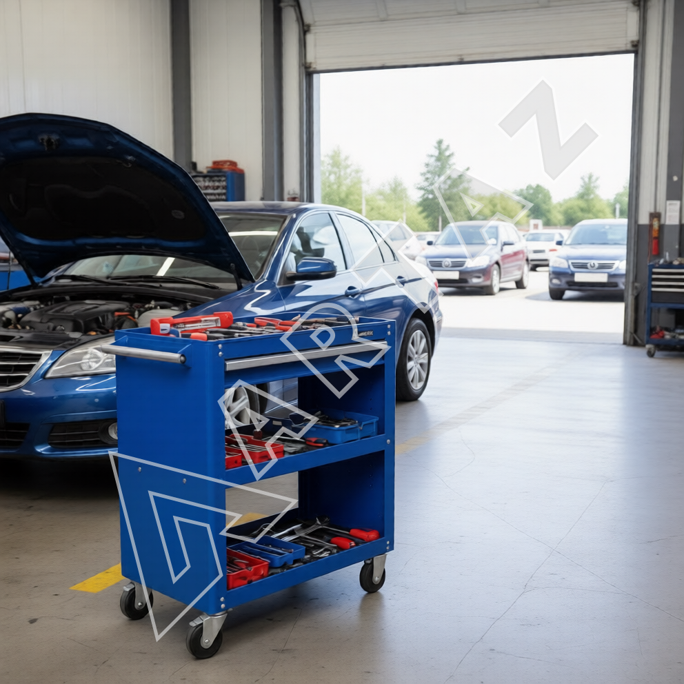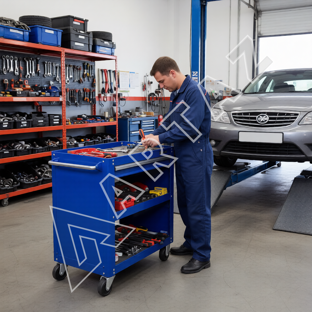Выдвижной ящик с направляющими на подшипниках выдерживает нагрузку до 20 кг, а общий вес нагрузки на тележку составляет 100 кг. Открытые полки способствуют быстрому доступу к инструментам и материалам, ускоряя выполнение задач на СТО, автосервисах, производствах и мастерских. Синий цвет изделия придаёт рабочему месту аккуратный и профессиональный вид.