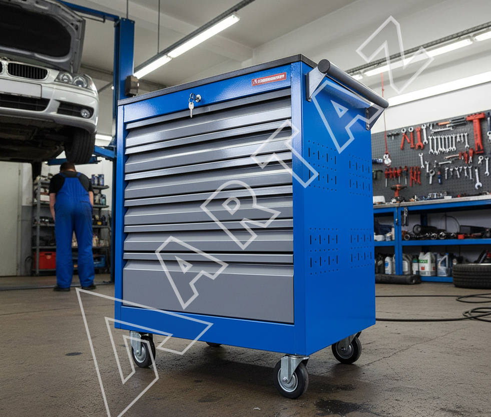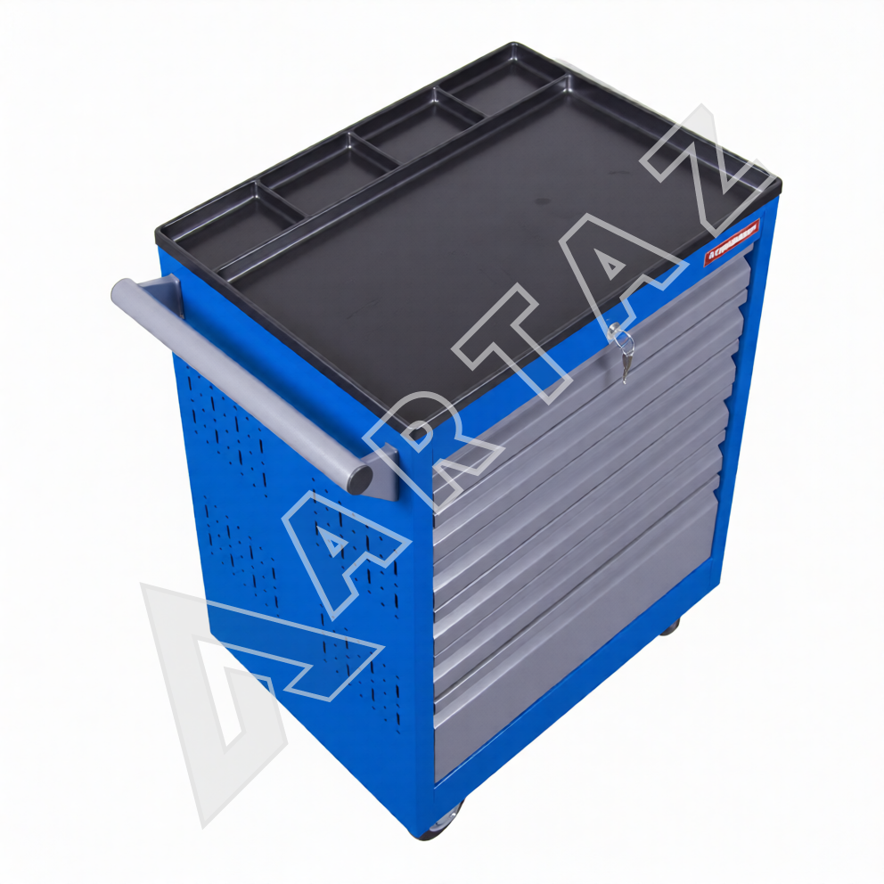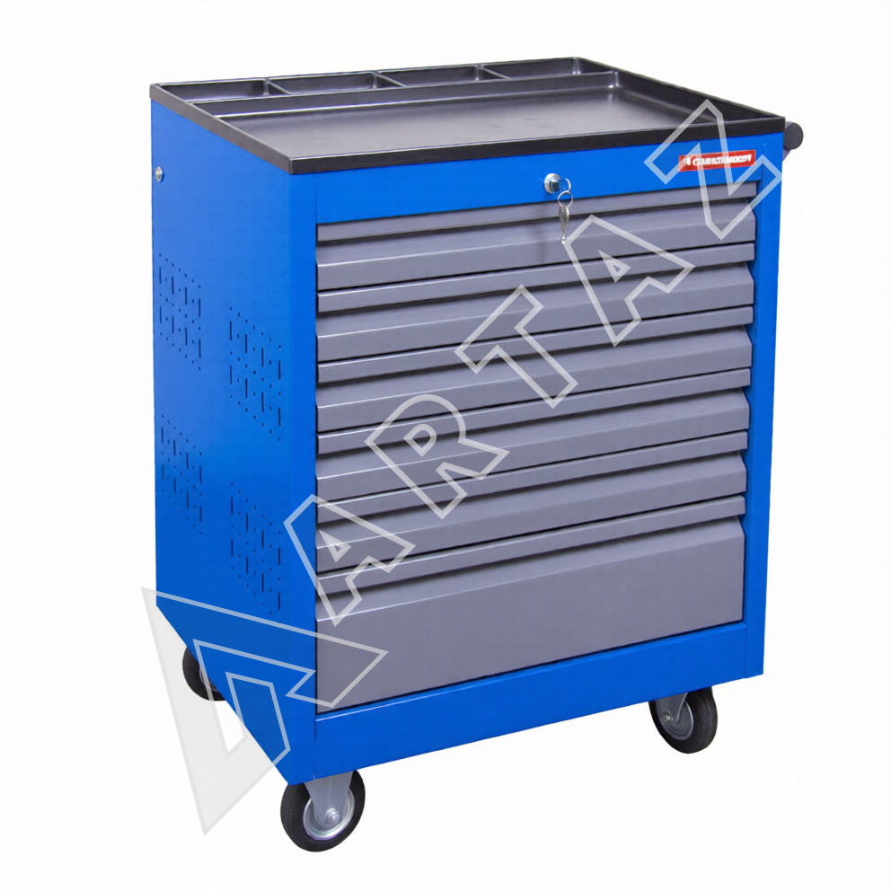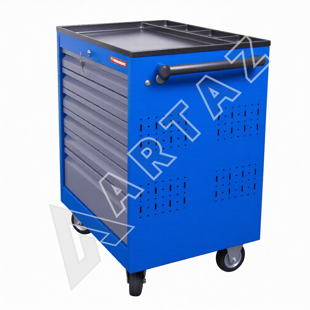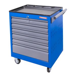 Тележка оснащена 6 ящиками, включая 5 выдвижных полок и один большой ящик, что позволяет рационально распределить инструменты и материалы. Система центрального замка гарантирует безопасность хранения, а фиксируемые колеса обеспечивают стабильность и мобильность одновременно. Корпус выполнен из прочного металла с порошковым покрытием, что повышает износостойкость и долговечность изделия. Лоток с органайзером на столешнице помогает всегда держать под рукой мелкие детали. Тележка будет удобна как для профессионального инструмента, так и для домашнего использования, поддерживая порядок и ускоряя рабочие процессы.