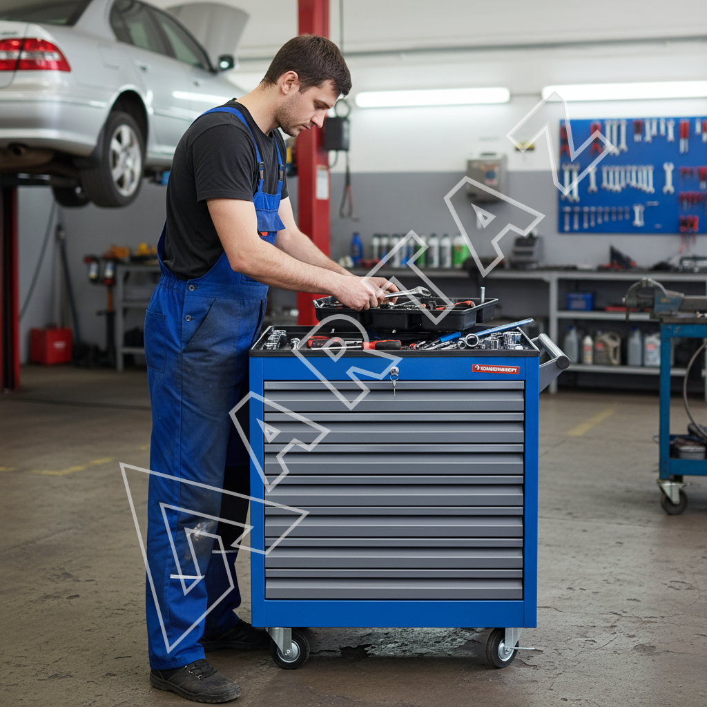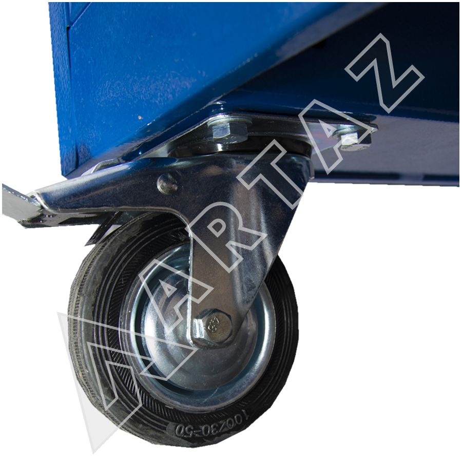 Тележка выполнена из прочного металла с порошковым покрытием, что гарантирует долговечность и защиту от повреждений. Семь вместительных ящиков выдерживают до 30 кг нагрузки каждый, что позволяет хранить как мелкие детали, так и крупные инструменты. Удобная система фиксации колес с блокировкой обеспечивает устойчивость и безопасность при перемещении. Центральный замок защищает содержимое от несанкционированного доступа, а лоток с органайзером на столешнице помогает всегда держать под рукой мелкие элементы. Компактные габариты (562х395х795 мм) позволяют эффективно использовать пространство рабочей зоны.