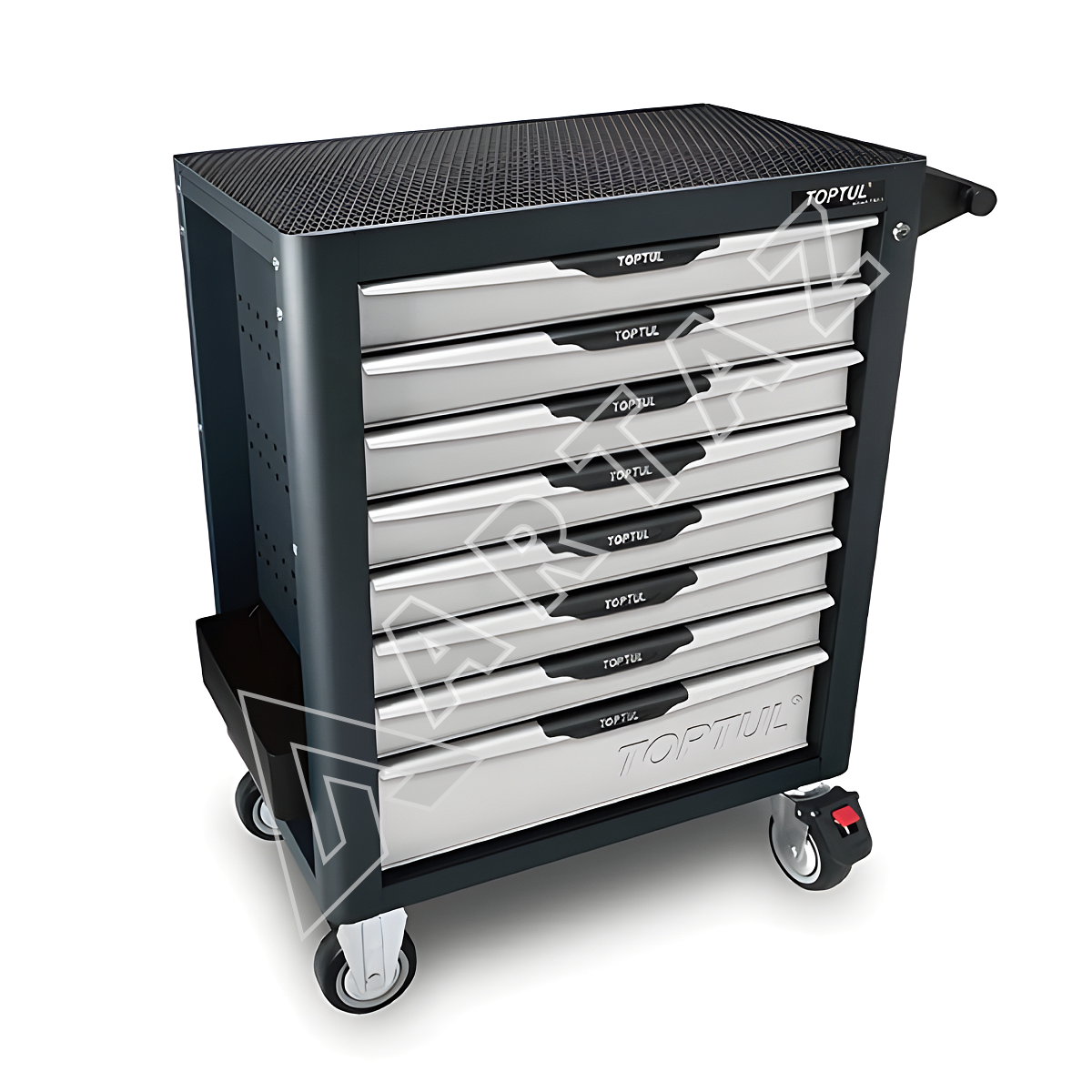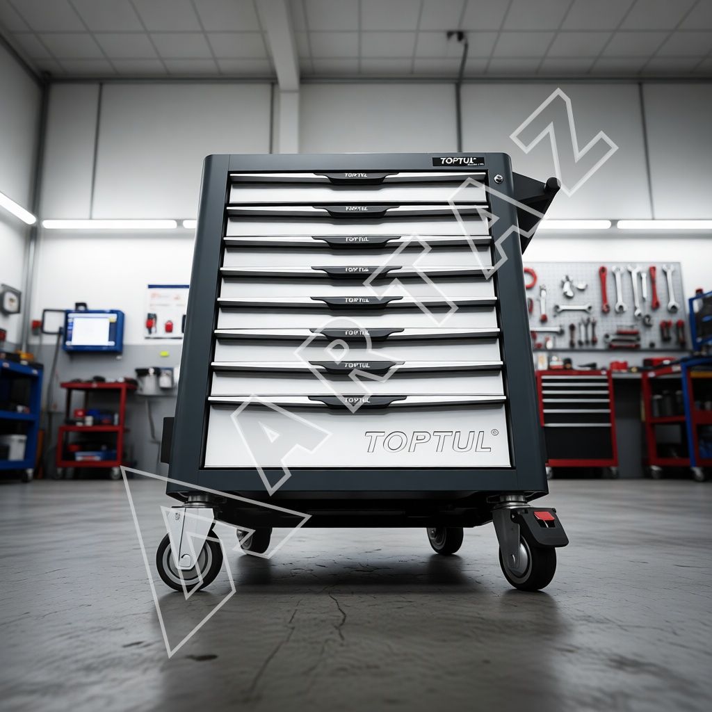 Тележка GE-32203 от Toptul – это прочная конструкция из сварной стали с порошковым защитным покрытием, созданная для интенсивной эксплуатации. Система RFS (Rapid Fix System) гарантирует надежную фиксацию инструментов в ложементах, что ускоряет поиск и исключает потерю инвентаря. Восьмиъярусная конструкция включает 7 средних и 1 большой ящик, способных выдержать груз до 45 кг каждый, а общая нагрузка тележки достигает 680 кг. Все ящики оснащены подшипниковыми направляющими, открываются плавно и зафиксированы центральным замком с функцией блокировки открывания более одного ящика одновременно, что предотвращает опрокидывание.