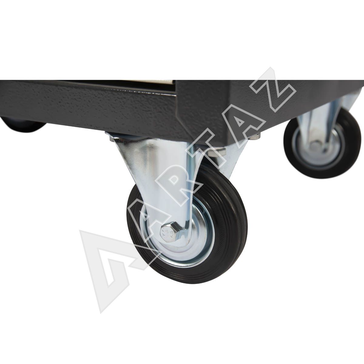 - Маневренность: Четыре усиленных колеса (два из которых поворотные с тормозом) позволяют легко перемещать тележку по цеху.