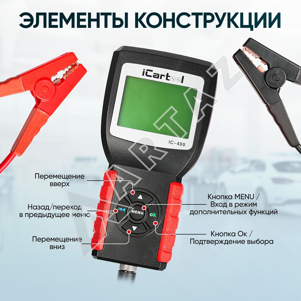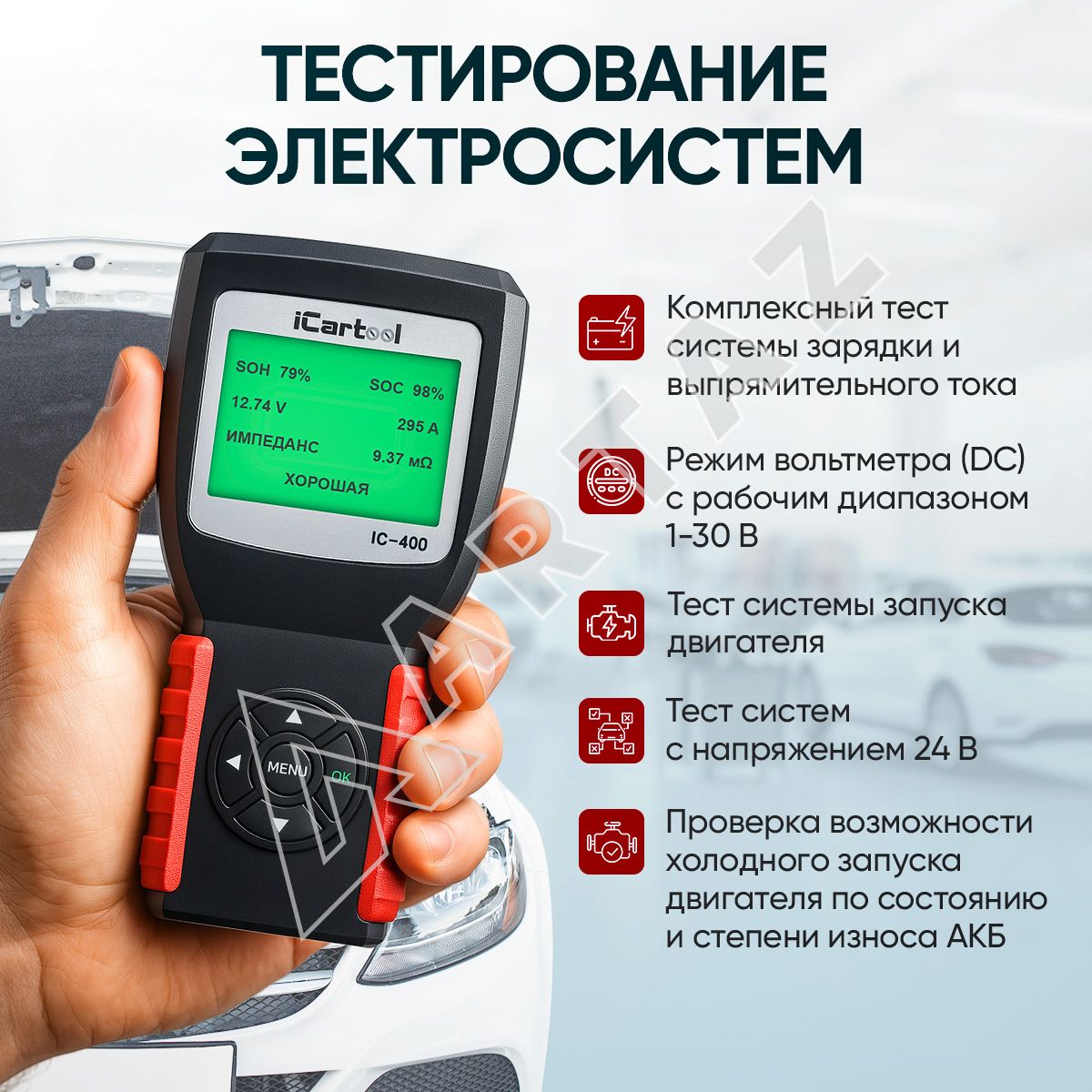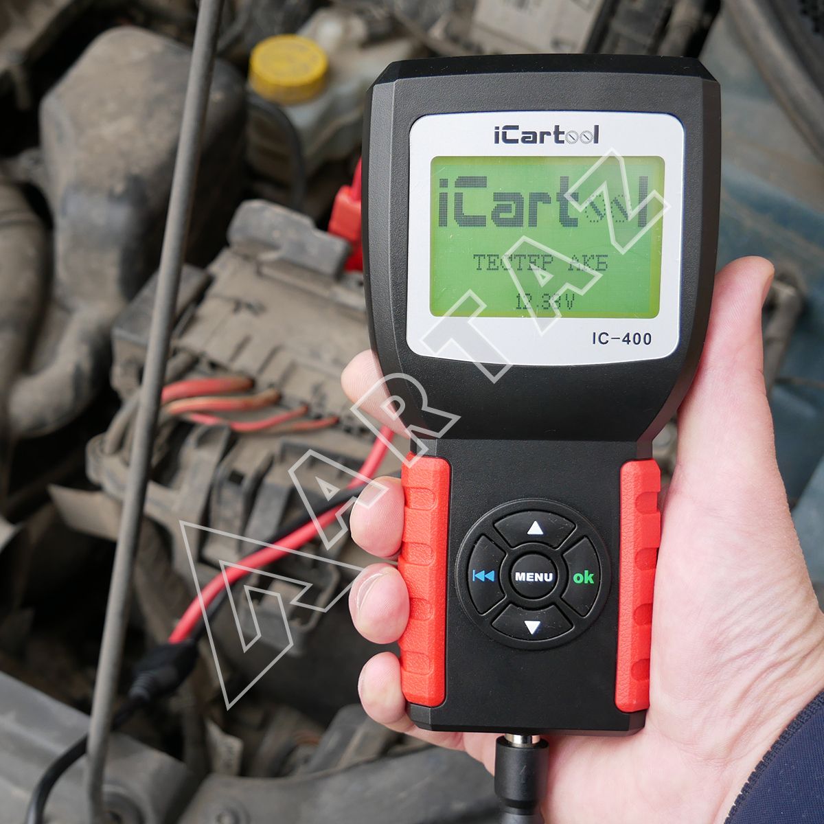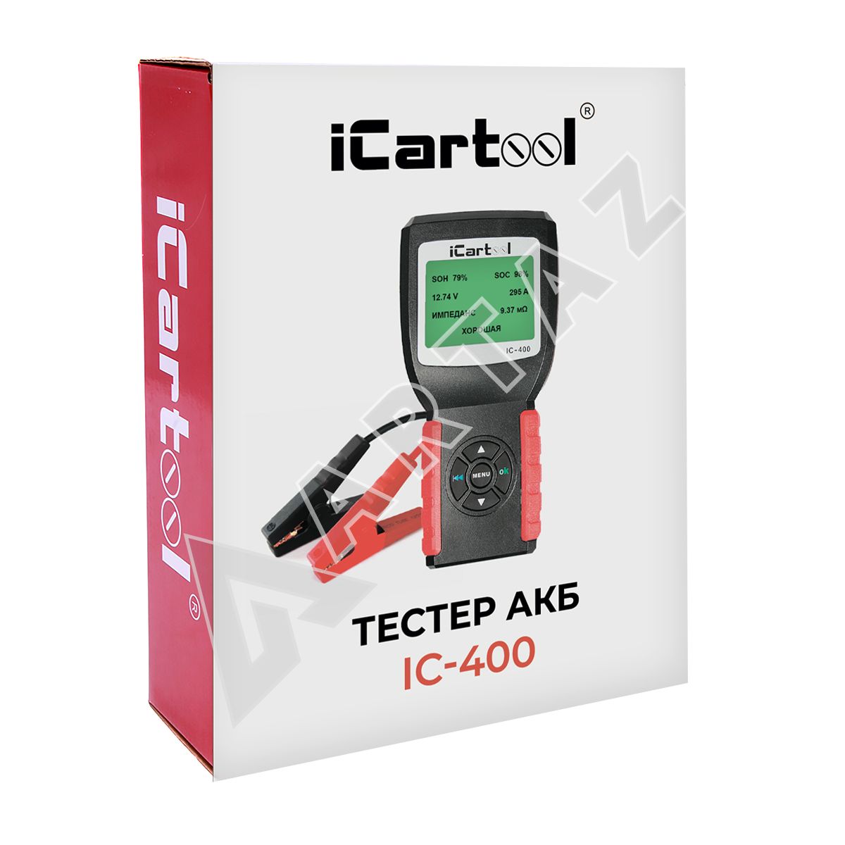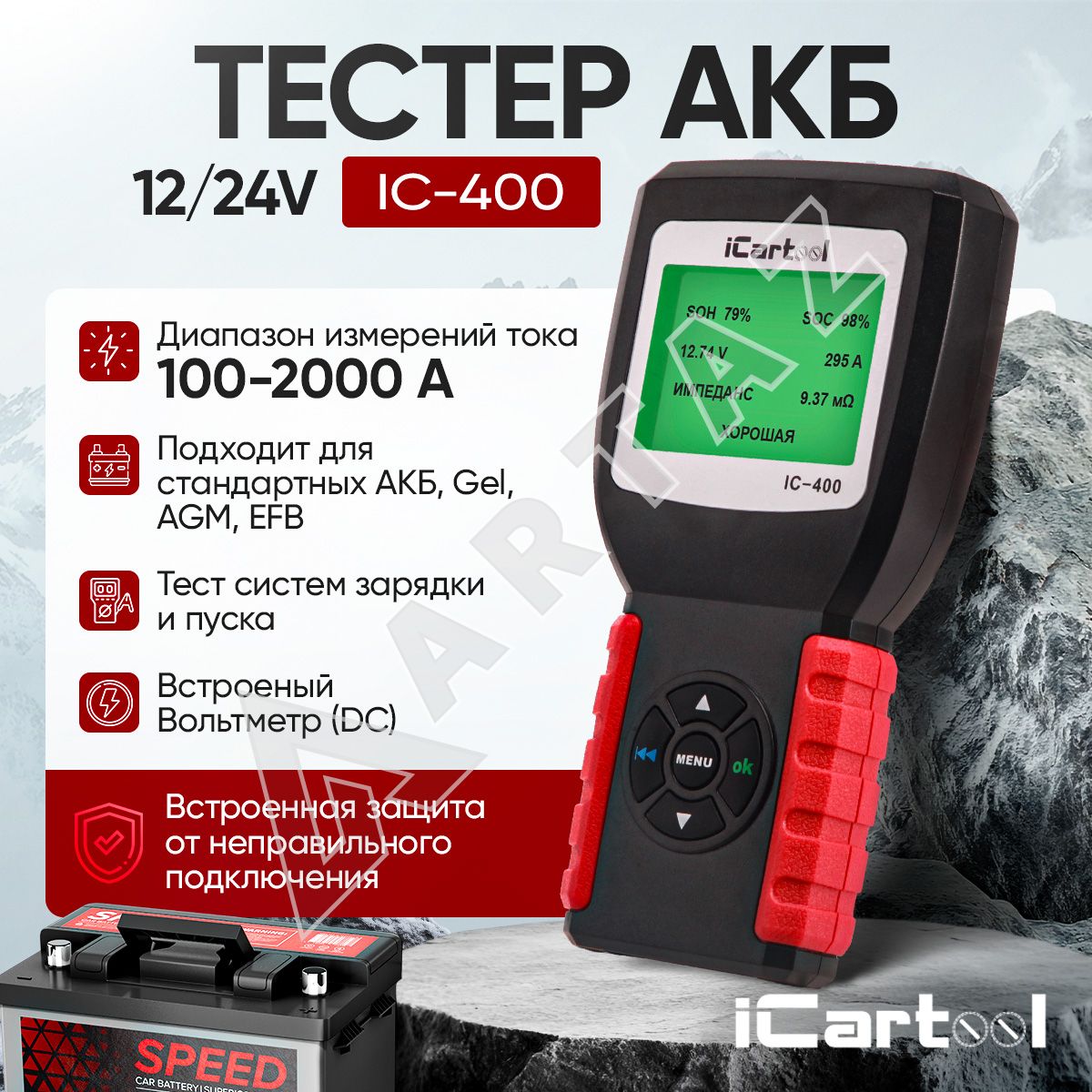 Тестер аккумуляторных батарей AGM, EFB, Gel 12/24В до 200Ач, нагрузка 2000А с защитой от переполюсовки iCartool IC-400
