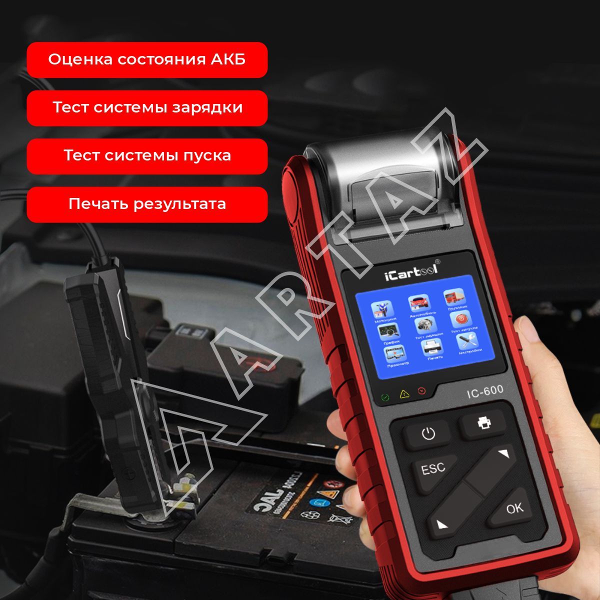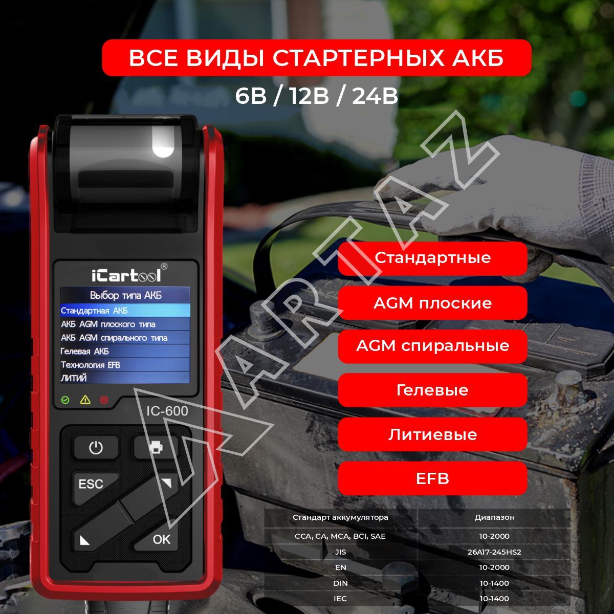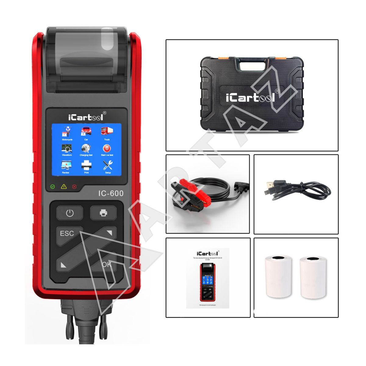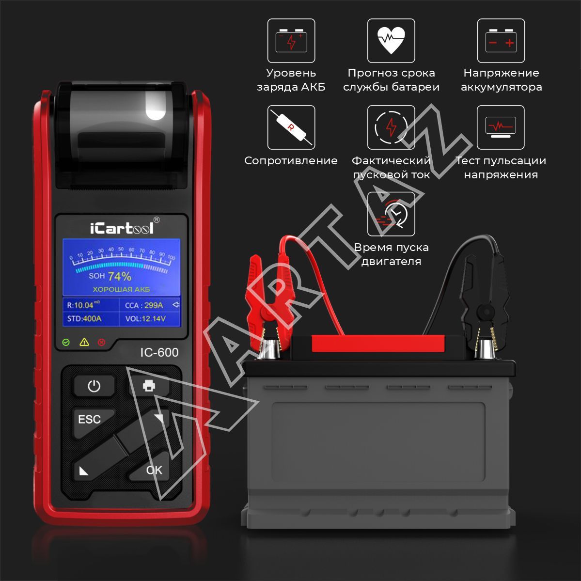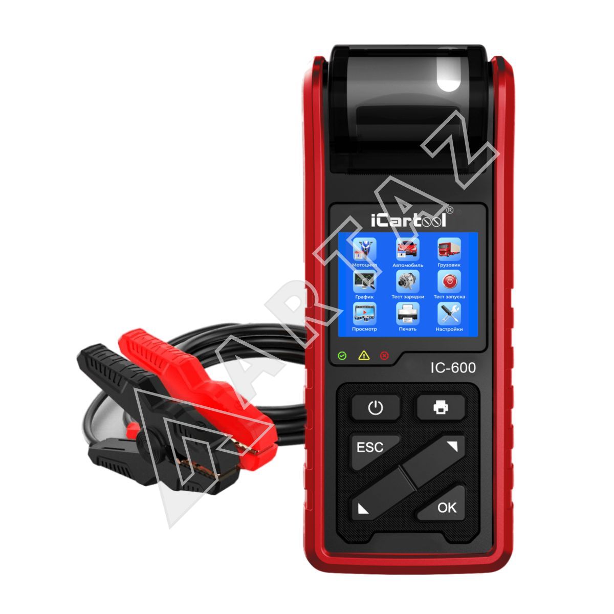 Тестер аккумуляторов 6/12/24В AGM EFB GEL с цифровым индикатором и встроенным термопринтером iCartool IC-600