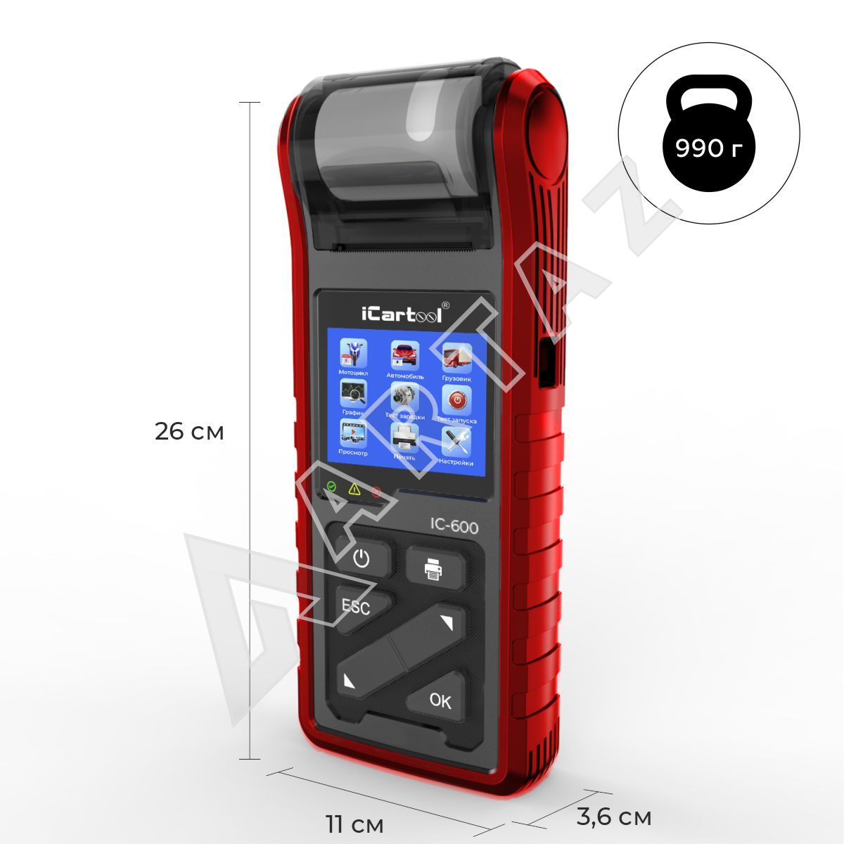 Тестер аккумуляторных батарей iCartool IC-600 предназначен для профессиональной диагностики состояния АКБ напряжением 6, 12 и 24 В. Устройство подходит как для легковых автомобилей, так и для грузового и специализированного транспорта, обеспечивая точную оценку состояния аккумулятора и систем пуска и зарядки.