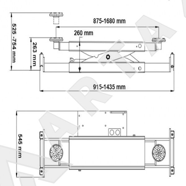 Atis RJ-8A сочетает прочную конструкцию и удобство эксплуатации: пневматическая педаль обеспечивает автономное управление без лишних усилий. Регулируемая длина 875–1680 мм дает возможность работать с разными типами шасси, а диапазон колеи 915–1435 мм обеспечивает точную установку опор. Низкая минимальная высота подхвата 260 мм упрощает работу с низко расположенными агрегатами, высота подъема 525 мм обеспечивает достаточный запас при монтаже. Конструктивная масса 149 кг обеспечивает устойчивость при манипуляциях в интенсивном режиме.