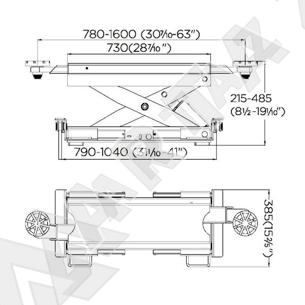 - Колея: 790–1040 мм — совместимость с канавными, ножничными и четырёхстоечными подъемниками.