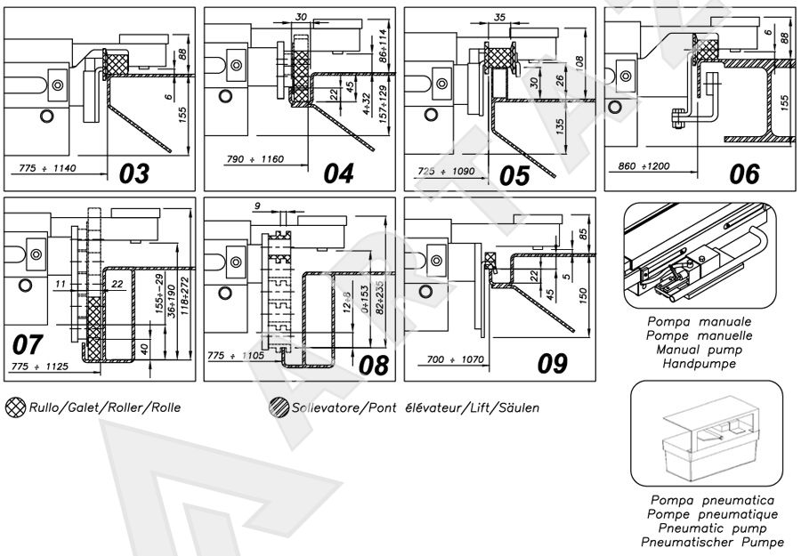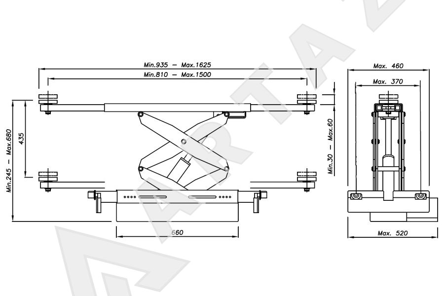 - Тип привода: пневмогидравлический; высота подъёма 435 мм, минимальная высота подхвата 245 мм.