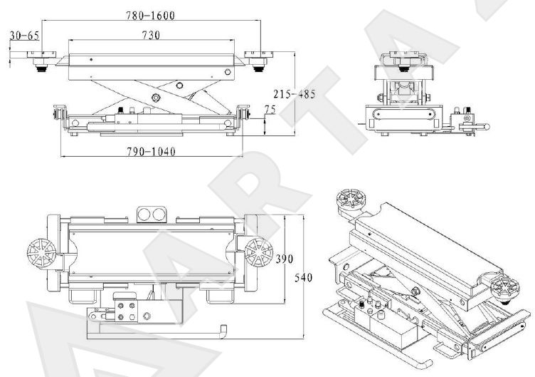 - Минимальная высота подхвата 215 мм, высота подъёма 485 мм — подходит для низкопрофильных и стандартных кузовов.