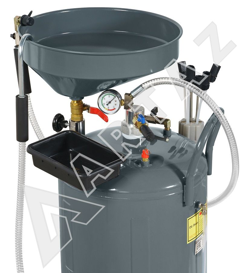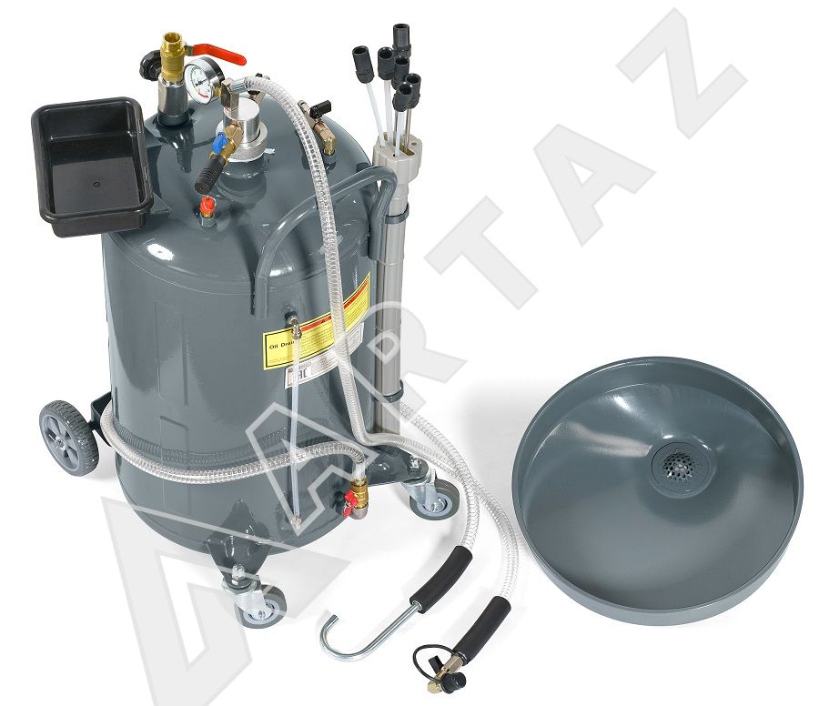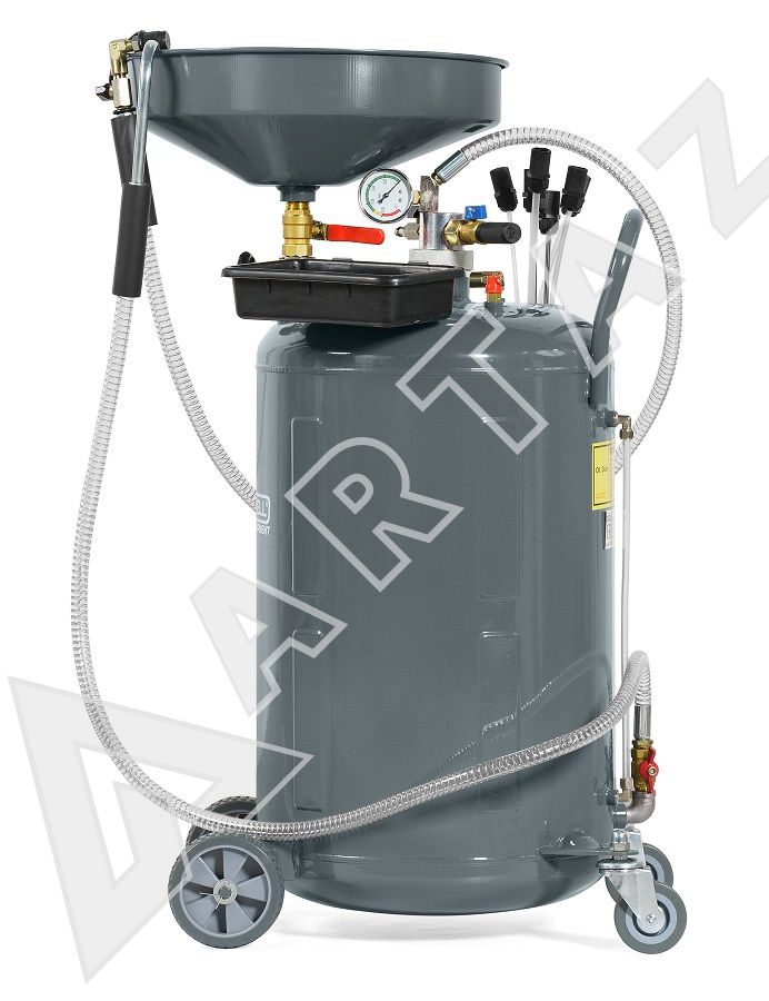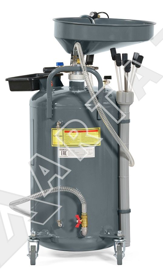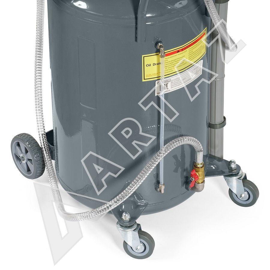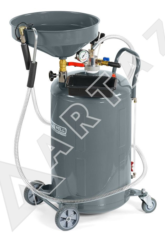 KRW1832.80L сборник KraftWell KRW1832.80L предназначен для сбора отработанного масла, антифриза и других технических жидкостей (с температурой до 60°C) с двигателей, коробок передач и дифференциалов любых автомобилей самотеком и с помощью пневматической откачки. Процедура откачки технических жидкостей через щупы основана на принципе вакуумирования (Вентури-вакуумная вытяжная система), при котором создается разряжение и жидкость засасывается в емкость, и используется в тех случаях, когда слив невозможен. После создания вакуума в установке, она работает самостоятельно. Нет необходимости в постоянном подключении к сети сжатого воздуха. Установка для слива масла оснащена колесами и тем самым легко передвигается по рабочей зоне. Также маслосборника оснащен специальным гибким шлангом для слива отработанного масла из маслосборника.