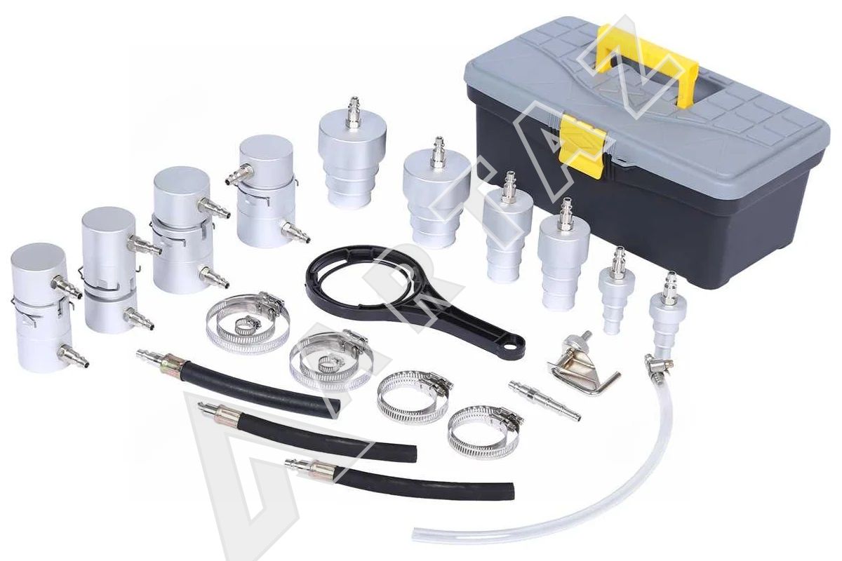 - Полный комплект адаптеров и шлангов в кейсе упрощает подключение к различным моделям автомобилей.