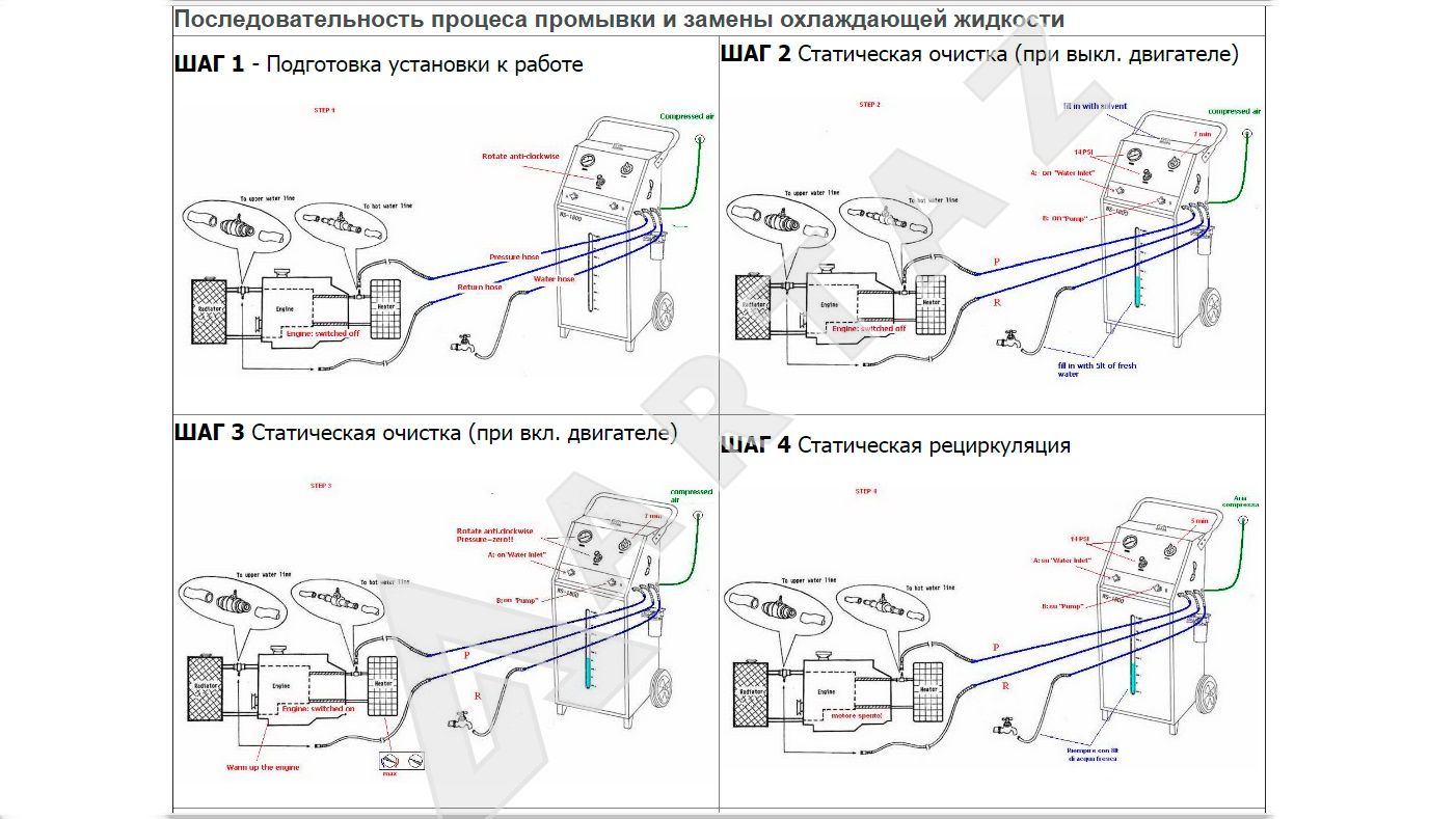 Преимущества:Установка выводит ржавчину и другие загрязнения , Простая методика замены, очистки и подсоединения к автомобилю , Быстрая замена охлаждающей жидкости
