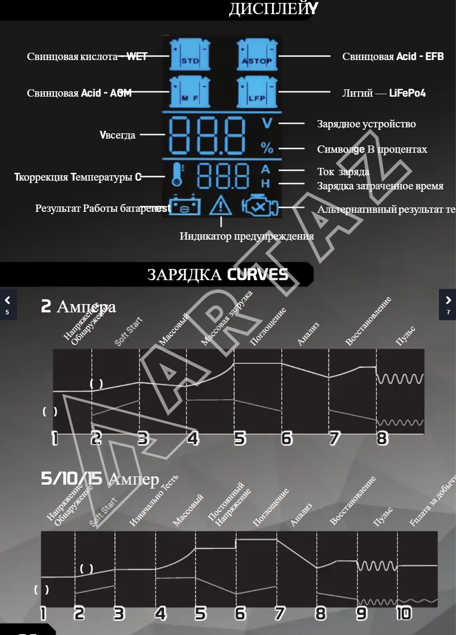 Это профессиональный инструмент, созданный для использования на станциях технического обслуживания и автосервисах, где важны точность и безопасность в процессе зарядки аккумуляторов различных типов.