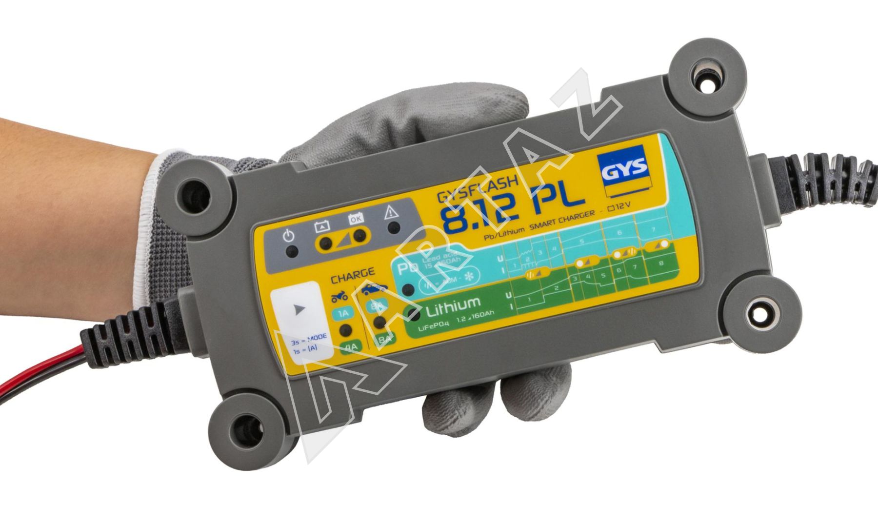 Зарядное устройство GYSflash 8.12 работает от сети 220 В и обеспечивает максимальный зарядный ток 8 А, что позволяет обслуживать аккумуляторы с емкостью от 15 до 240 Ач. Прибор оснащён режимами AGM и Refresh, а также функцией десульфатации, что гарантирует восстановление аккумуляторов и продление их срока службы. Защита класса IP65 обеспечивает надежную эксплуатацию в условиях пыли и влаги.